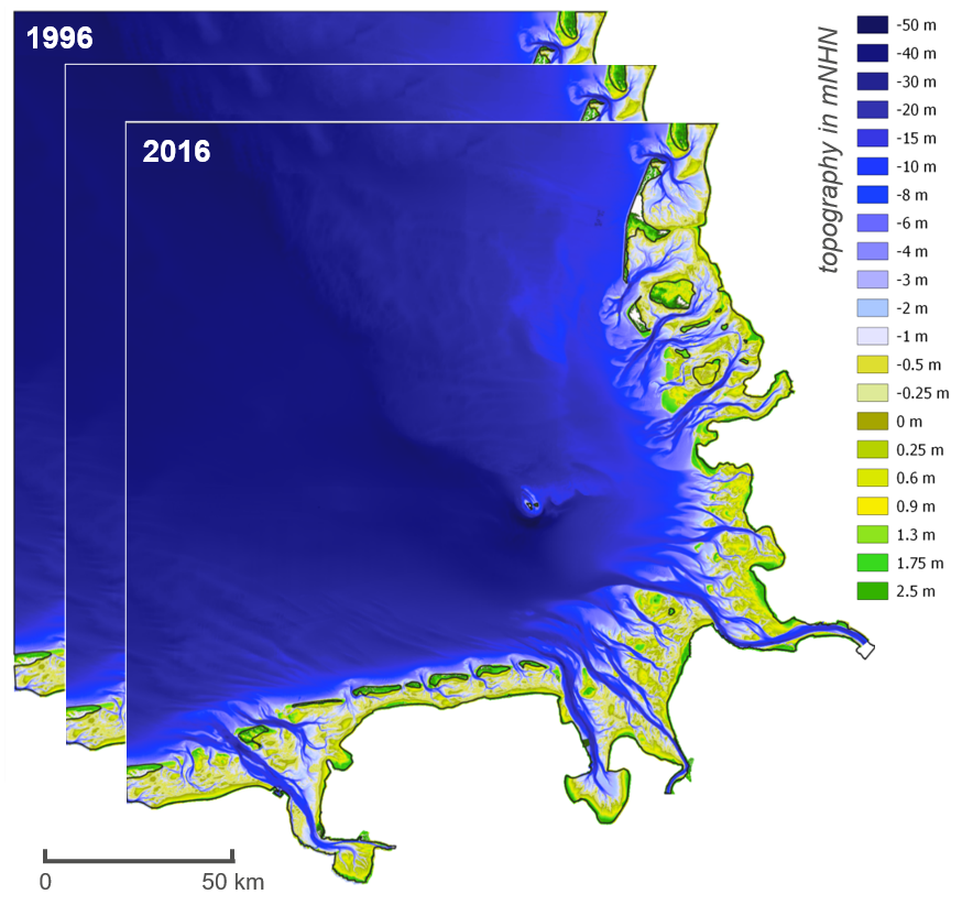- Oberflächensedimente sind weniger dynamisch als die Bathymetrie; gleichwohl verändert sich ihre Verteilung ebenfalls über die Zeit.