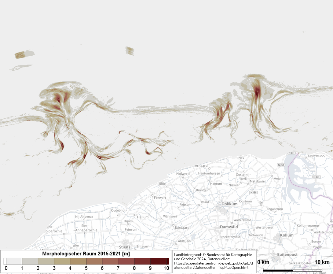 In diesem Use-Case wurden Daten des TrilaWatt-Projekts angewendet, um die jahresgemittelte Ausdehnung des Watts im Jahr 2020 zu bestimmen. Die Intertidalfläche ist somit ein Resultat der Verschneidung von Bathymetrie und jährlichen mittleren Tidehoch- und Tideniedrigwasser-Daten des numerischen Modells. Aus diesen Arbeiten wurden neue Datenprodukte zur topographischen Beschreibung der Gezeitenzone abgeleitet.
